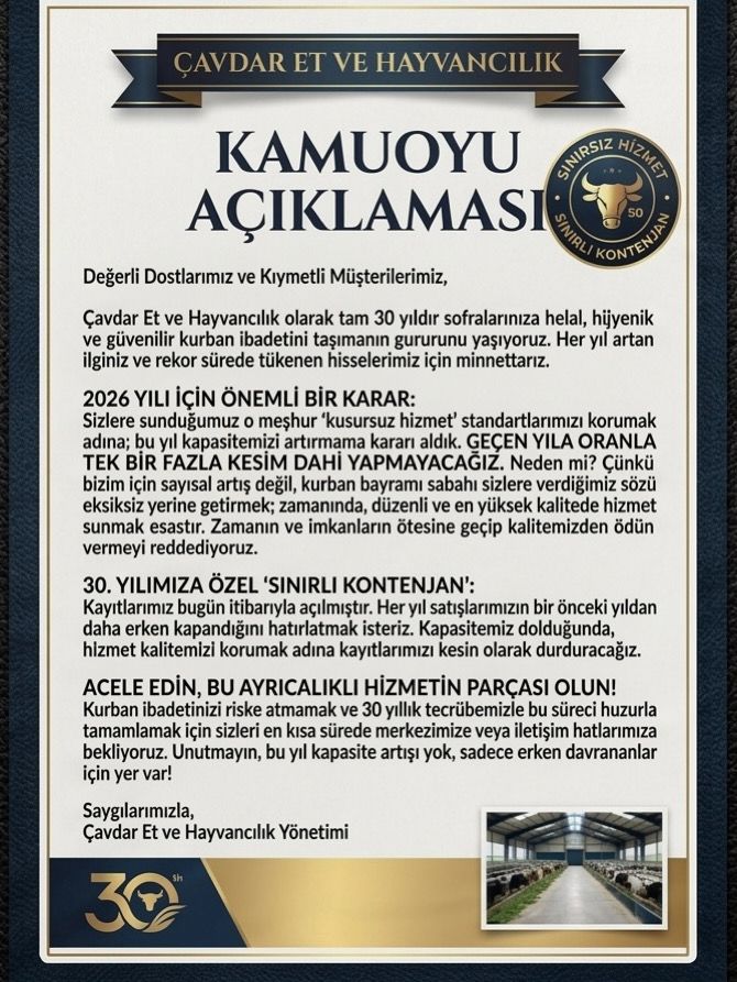 Halil ÇAVDAR, Mustafa ÇAVDAR ve Bekir ÇAVDAR üç kardeş devam ettirdikleri hayvancılık sektöründe her zaman müşterilerine kaliteli ve temiz hizmet sunmaktan gurur duymaktadırlar. Bununla birlikte kurbanlık satışlarını Çayırbağ Kasabası'nda bulunan çiftliklerinde devam ettirmektedirler. Almak için değil görmek için siz değerli dostları kendilerine ait çiftlikte misafir etmekten memnuniyet duyacaklarını belirtmektedirler. Hisse satışı, kesim ve parçalama konusunda hayvan alan herkese hem uygun fiyat hem de kalite standartlarının üstünde hizmet sunmaktadırlar....